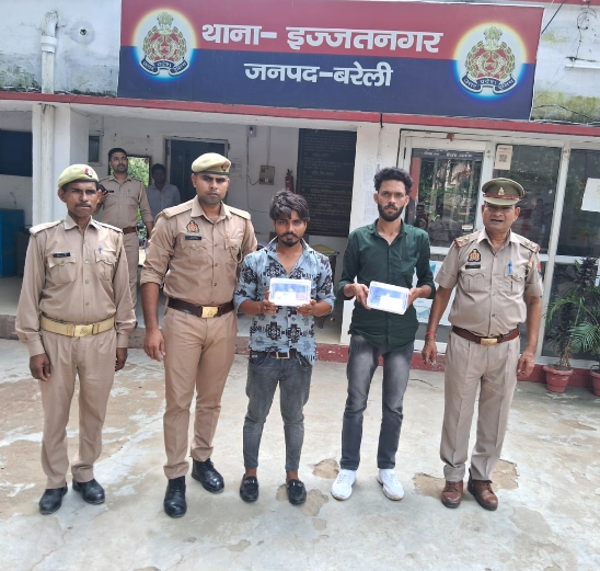 बरेली पुलिस की गिरफ्त में खड़े यह दोनों युवक बड़े ही शातिर अपराधी हैं जो बरेली में लव जिहाद का एजेंडा बड़ी हो सोची समझी साजिश के तहत चलाते थे, भोली भाली लड़कियों से सोशल मीडिया में फर्जी आईडी बनाकर दोस्ती करते थे उसके बाद उनके वीडियो फोटो बना कर उनको परेशान करते थे यही नहीं ब्लैकमेल भी किया करते थे। लेकिन पुलिस ने इन दोनो की हिरासत में लेकर इनकी करनी की पोल खोल दी है, दरअसल दिनांक 19.09.24 को थाना इज्जत नगर क्षेत्र बरेली की पुलिस चौकी कर्मचारी नगर के पास दो लडकियां व दो लडके आपस में वार्ता कर रहे थे और कुछ देर बाद लडकियां आक्रोशित होकर बार-बार मोबाइल दिखा रही थी। संदिग्ध जान पडने पर आसपास के रहने वाले कुछ व्यक्ति मौके पर पहुंचे और पूछताछ की गयी तो लडकियां वहां से बिना नाम पता बताये चली गयी और जब उक्त लड़को से नाम पता पूछे तो अपना नाम राहुल व सतीश बताये, जिस पर स्थानीय लोगो को शक होने पर इन दोनों को चौकी कर्मचारी नगर ले आए। पुलिस द्वारा उक्त दोनों लडको से गहनता से पूछताछ की गयी तो एक ने अपना नाम नौशाद पुत्र बाबू अहमद नि0 ग्राम परतापुर चौधरी थाना इज्जतनगर बरेली बताया, जब उसकी तलाशी ली गयी तो पाकेट से 05 आधार कार्ड जिसमें हिन्दू व मुस्लिम नाम तथा फोटो एवं आधार नंबर अलग-अलग बरामद हुए तथा एक मोबाईल फोन बरामद हुआ जिसको खोलकर चैक किया गया तो नौशाद द्वारा उसमें हिन्दू व मुस्लिम नाम से 06 इंस्टाग्राम आईडी बनाकर तमाम लडकियो एवं महिलाओं से अश्लील चैट कर वीडियो कालिंग कर अश्लील स्क्रीन वीडियो रिकोर्डिंग पाया गया। दूसरे अभियुक्त ने अपना नाम आमान पुत्र इनामु उऱहमान नि0 ग्राम परतापुर चौधरी थाना इज्जतनगर बरेली बताया, तलाशी से इसके पास भी 03 आधार कार्ड हिन्दू व मुस्लिम नाम से और हिंदू नाम से अलग-अलग आधार कार्ड नं0 के मिले एवं एक मोबाइल फोन जिसमें कई लडकियों के न्यूड वीडियो एवं अश्लील चैट मिले। प्रथम दृष्टया उक्त दोनों लडकों का कार्य कूट रचित आधार कार्ड रखने, प्रयोग करने एवं फर्जी आईडी बनाकर लडकियों को भ्रमित करने तथा ब्लैकमेल करने का अपराध पाकर इन्हें गिरफ्तार कर लिया गया। मु0अ0सं0 673/24 धारा 339/340/336(3) बीएनएस व 66D आई0टी0एक्ट पंजीकृत कर जेल भेज दिया गया ।
