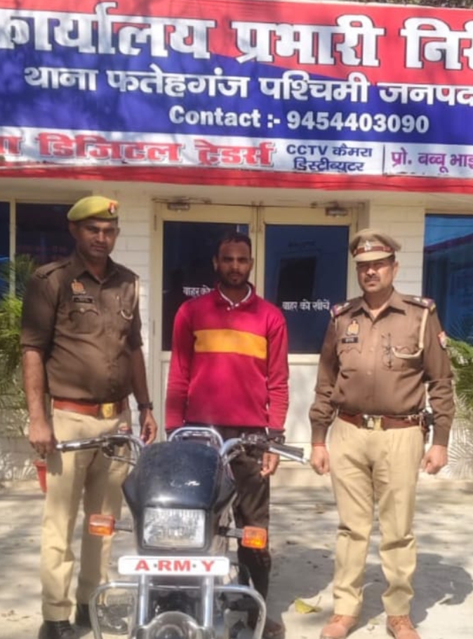 बरेली। फतेहगंज पश्चिमी थाना पुलिस ने चेकिंग के दौरान रहपुरा अंडर पास से चोरी की बाइक समेत एक युवक को गिरफ्तार कर गुरुवार को जेल भेज दिया। जानकारी के मुताबिक लगभग 15 दिन पहले पिपरिया गांव निवासी मुकुट सिंह की बाइक अपने गांव से शादी समारोह कार्यक्रम के दौरान चोरी हो गई थी। पीड़ित मुकुट सिंह की तहरीर पर पुलिस ने अज्ञात व्यक्ति के खिलाफ मुकदमा कर लिया था। फतेहगंज पश्चिमी थाना प्रभारी प्रदीप कुमार चतुर्वेदी ने बताया कि बुधवार 12 फरवरी शाम पुलिस टीम हाइवे के निकट रहपुरा अंडर पास पर चेकिंग कर रही थी। इसी दौरान बाइक से आ रहे व्यक्ति को पुलिस ने रुकने के लिए हाथ से इशारा किया तो वह अपनी बाइक की स्पीड चेंज कर भागने लगा पुलिस टीम ने उसका पीछा कर पकड़ लिया। और उसे अपने साथ थाना ले आए। पुलिस पूछताछ पर उसने अपना नाम रणबीर निवासी गांव रफियाबाद बताया। उसके बाद पुलिस ने उसकी बाइक नंबर और चेसिस नंबर ऐप पर चेक किए तो वह फर्जी निकले। पुलिस के द्वारा सख्ती करने पर उसने बताया कि उसने बाइक अपने गांव के युवक हरेन्द्र से खरीदी थी। जबकि हरेंद्र ने बाइक को पिपरिया गांव से चोरी किया था। पुलिस ने पिपरिया गांव निवासी मुकुट सिंह ने अपनी चोरी की बाइक की पहचान की। पुलिस ने बाइक को सीज कर रणवीर को बृहस्पतिवार को जेल भेज दिया। पुलिस ने हरेंद्र सिंह वांछित कर उसकी तलाश कर रही है।