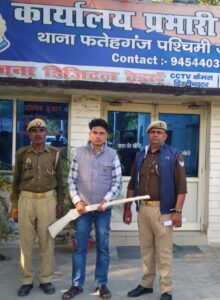 बरेली। फतेहगंज पश्चिमी थाना फतेहगंज पश्चिमी पुलिस ने एक आरोपी युवक को अवैध बंदूक और तीन जिंदा कारतूस के साथ गिरफ्तार किया है। थाना प्रभारी अभिषेक कुमार ने बताया कि पुलिस टीम गश्त पर थी, तभी मुखबिर से सूचना मिली कि एक युवक अवैध हथियार के साथ घूम रहा है। सूचना मिलते ही पुलिस ने घेराबंदी कर संदिग्ध युवक को दबोच लिया। पूछताछ में आरोपी युवक ने अपना नाम गौतम पुत्र भगवान दास निवासी ग्राम भोलापुर, थाना फतेहगंज पश्चिमी बताया। और उसने बताया कि वह हरियाणा की एक प्लाई फैक्ट्री में काम करता है।