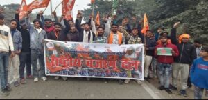 राष्ट्रीय बजरंग दल पदाधिकारियों ने बांग्लादेश सरकार का पुतला दहन किया।