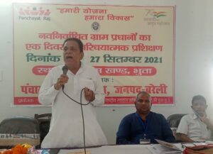 भुता (बरेली)। पंचायती राज प्रशिक्षण संस्थान द्वारा प्रायोजित एवं राष्ट्रीय ग्राम स्वराज अभियान के अंतर्गत पंचायती राज विभाग द्वारा विकास खंड के सभागार में आयोजित नवनिर्वाचित ग्राम प्रधान का विकास खंड स्तरीय एक दिवसीय अनावासीय परिचयात्मक प्रशिक्षण कार्यक्रम के द्वितीय बैच का आज समापन हुआ जिसका शुभारंभ मुख्य अतिथि ब्लॉक प्रमुख जगमोहन सिंह ने दीप प्रज्वलित कर उन्होंने कहा कि गांव के विकास के लिए मैं हमेशा प्रधानों के साथ खड़ा मिलूंगा यह प्रशिक्षण गांव के विकास में मील का पत्थर साबित होगा। इस अवसर पर एनआईआरडी के राज्य प्रशिक्षक अमित कुमार सिंह तोमर ने प्रशिक्षण देते हुए आय के स्रोत पर चर्चा की और कहां कि आज हमारे आसपास जल, जंगल, जमीन, जानवर और जन के द्वारा आय के कौन-कौन से स्रोत हो सकते हैं जिससे कि पंचायत की आय में बढ़ोतरी हो सके। श्री तोमर ने कहा की केंद्र और प्रदेश सरकार द्वारा पंचायत को मिलने वाले विभिन्न पुरस्कारों को पाने के लिए सामूहिक सहभागिता भी जरूरी है। उन्होंने कहा कि महात्मा गांधी का सपना अब साकार होगा हमारा गांव सशक्त और आत्मनिर्भर बनेगा जिसमें प्रधान की अहम भूमिका को उदाहरण देकर भी समझाया तथा सतत विकास लक्ष्य वर्ष 2030 तक 17 बिंदुओं पर चर्चा करते हुए लक्ष्य तक पहुंचने का संदेश दिया और कहा कि कोई पीछे ना छूटे। पंचायत राज व्यवस्था के बारे में जानकारी देते हुए प्रशिक्षण के उद्देश को बताया और कहां कि वह दिन दूर नहीं जब ग्रामीणों की सहायता से गांव में विकास की गंगा बहेगी । मॉडल पंचायत पर फिल्म दिखाकर प्रधानों को समूह चर्चा के माध्यम से जागरूक किया। ग्राम सभा और ग्राम पंचायत की बैठक एवं समितियों की जानकारी चर्चा एवं फिल्म आदि के द्वारा दी। प्रशिक्षक धनंजय तथा मुकेश ने विभिन्न विषयों की जानकारी दी। प्रशिक्षकों द्वारा समूह चर्चा, खेल एवं फिल्म के माध्यम से विभिन्न विषयों पर प्रशिक्षण दिया। प्रमुख रूप से ग्राम पंचायत विकास योजना के निर्माण के पांच चरण, स्वास्थ्य एवं पोषण कार्यक्रम में पंचायत की भागीदारी, केंद्रीय एवं राज्य वित्त आयोग की जानकारी के साथ-साथ पंचायत पुरस्कारों, स्वच्छ भारत मिशन, ग्राम स्वराज की जानकारी खेल और फिल्म दिखा कर दी गई। इस अवसर पर एडीओ पंचायत वीरपाल सिंह ने प्रशिक्षण के सफल संचालन के लिए मास्टर प्रशिक्षकों की सराहना की। इस अवसर पर लेखाकार प्यारे लाल कश्यप, अपर संख्या अधिकारी राघवेंद्र सक्सेना, ग्राम पंचायत सचिव रविंद्र गंगवार, आदेश यादव का विशेष सहयोग रहा। जिला पंचायत राज अधिकारी ने बताया कि विकास खंड बिथरी चैनपुर का प्रथम बैच 28 सितंबर को प्रातः 10 बजे से साय 5 बजे तक विकास खंड सभागार में आयोजित किया जाएगा जिसकी तैयारियां की जा चुकी है