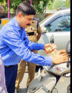 जो चालक हेलमेट पहना हुआ था सीट बेल्ट लगा हुआ था उसको गुलाब का फूल बुके देकर सम्मानित किया गया और जो नहीं लगाया था उसको जागरूक किया गया कि आगे से वह सीट बेल्ट पहने और हेलमेट का उपयोग करें क्योंकि जीवन बहुत अनमोल है।